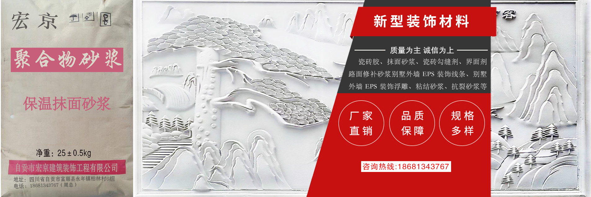 服務(wù)熱線: 自貢市宏京建筑裝飾工程有限公司,成立于 2018 年,廠房位于位于四川省自貢市富順縣永年鎮(zhèn)柏林村 6 組柏林村小。本公司集保溫材料聚合物改性水泥基砂漿材料研發(fā)、生產(chǎn)、銷(xiāo)售于一體的干粉砂漿材料公司。 公司基于低碳、環(huán)保、綠色、節(jié)能的經(jīng)營(yíng)理念,生產(chǎn)推廣高效、節(jié)能、環(huán)保的新型保溫材料等產(chǎn)品。本公司 產(chǎn)品具有質(zhì)量?jī)?yōu)良、良好技術(shù)、精湛工藝、成本低等優(yōu)勢(shì)。公司成立以來(lái),一直視產(chǎn)品質(zhì)量為企業(yè)的生命, 堅(jiān)持“質(zhì)量為先,顧客至上”的服務(wù)宗旨,贏得了客戶(hù)的信賴(lài),并建立了完善的售前售后服務(wù)體系,歡迎各 界來(lái)